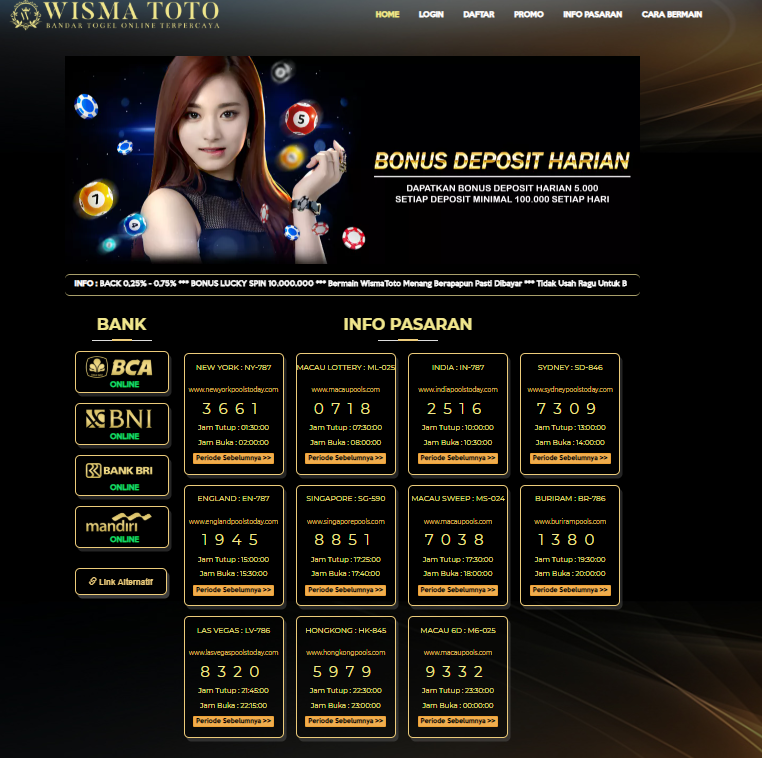 Maria Togel merupakan Situs Togel TERPERCAYA yang menyediakan pasaran Togel terlengkap, Live Games terpopuler & Permainan Slot Terbaik. HANYA DENGAN MINIMAL DEPOSIT Rp.10.000,- . BocoranBandot - Selamat datang di Situs Bocoran Angka Togel Terbaik di Indonesia yang dipersembahkan langsung oleh Oreo5D. Kami menyediakan angka bocoran togel untuk pasaran Totomacau, Cambodia, China, Sydney, Singapore dan Hongkong.Gunakan angka bocoran yang kami berikan untuk mendapatkan racikan angka mistis.